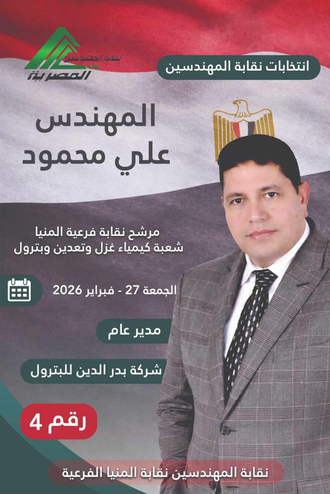 إيمانا بالدور النقابي في دعم زملائه المهندسين وتعزيز مكانتهم في المجتمع ترشح المهندس علي محمود لمجلس شعبة كيمياء غزل وبترول.