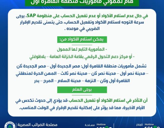كتب فتحي السايح تدعو مصلحة الضرائب المصرية الممولين، وخاصة المنضمين حديثًا إلى المنظومة الجديدة SAP، إلى سرعة التوجه لاستلام الأكواد.