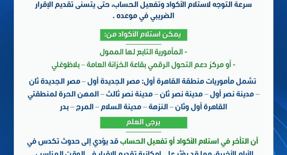 الضرائب: على ممولي مأموريات منطقة القاهرة أول سرعة استلام الاكواد وتفعيل الحسابات لتقديم الإقرارات في