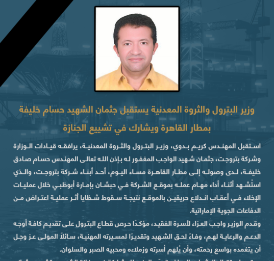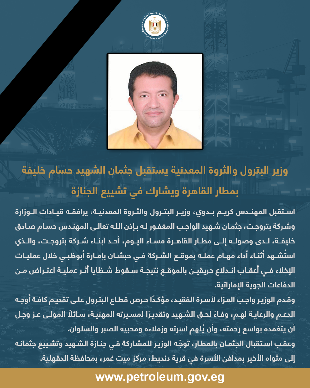 وزير البترول والثروة المعدنية يستقبل جثمان الشهيد حسام خليفة بمطار القاهرة ويشارك في تشييع الجنازة*