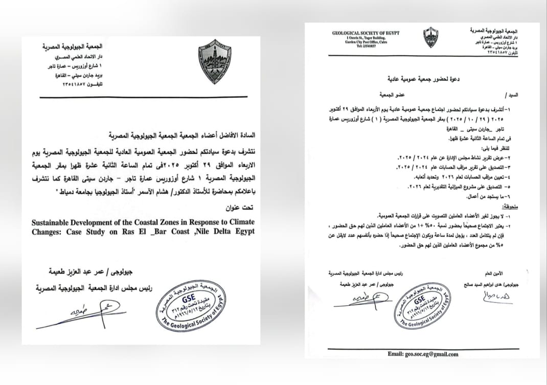 صرح الدكتور عمر طعيمة رئيس مجلس إدارة الجمعية الجيولوجية المصرية، إن الجمعية وجهت الدعوة لأعضاءها من الجيولوجيين للجمعية العمومية العادية التي ستعقد بعد غد الاربعاء، الموافق ٢٩ أكتوبر ٢٠٢٥، بمقر الجمعية بجاردن سيتي.