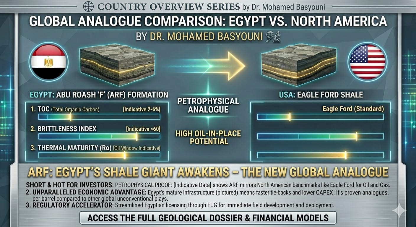 تُظهر دراستنا المقارنة (Global Analogue Comparison) أن “أبو رواش F” هو حوض زيت محبوس عالي الجودة. وتتراوح نسبة الكربون العضوي الكلي (TOC) فيه بين 2% إلى 6%، مما يدل على قدرته الإنتاجية العالية. علاوة على ذلك، يتميز التكوين بـ “مؤشر صلابة” (Brittleness Index) مرتفع يزيد عن 60، وهو عامل حاسم لنجاح عمليات التكسير الهيدروليكي (Fracking) وزيادة معدلات الاستخراج.