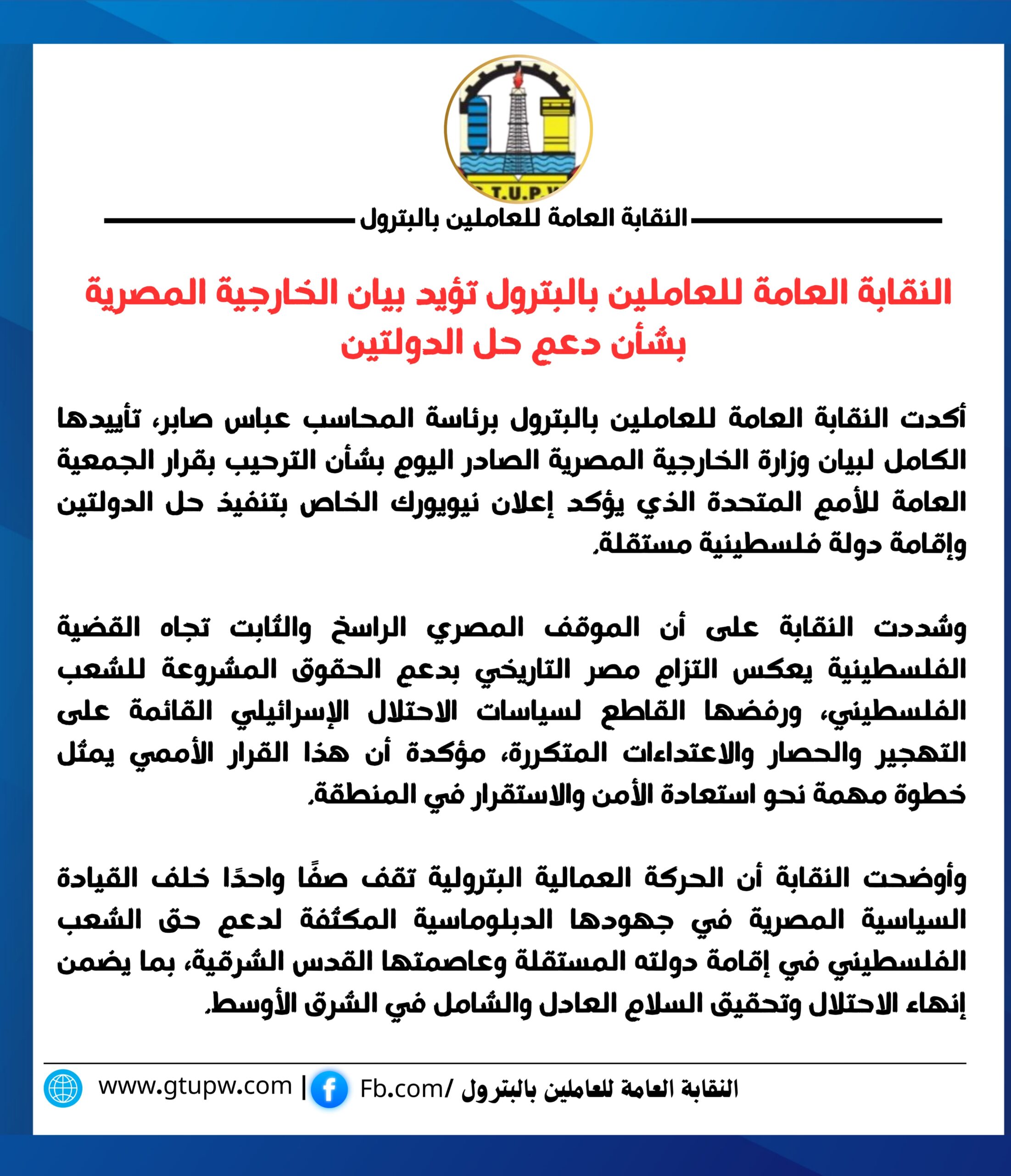 أكدت النقابة العامة للعاملين بالبترول برئاسة المحاسب عباس صابر، تأييدها الكامل لبيان وزارة الخارجية المصرية الصادر اليوم بشأن الترحيب بقرار الجمعية العامة للأمم المتحدة الذي يؤكد إعلان نيويورك الخاص بتنفيذ حل الدولتين وإقامة دولة فلسطينية مستقلة.