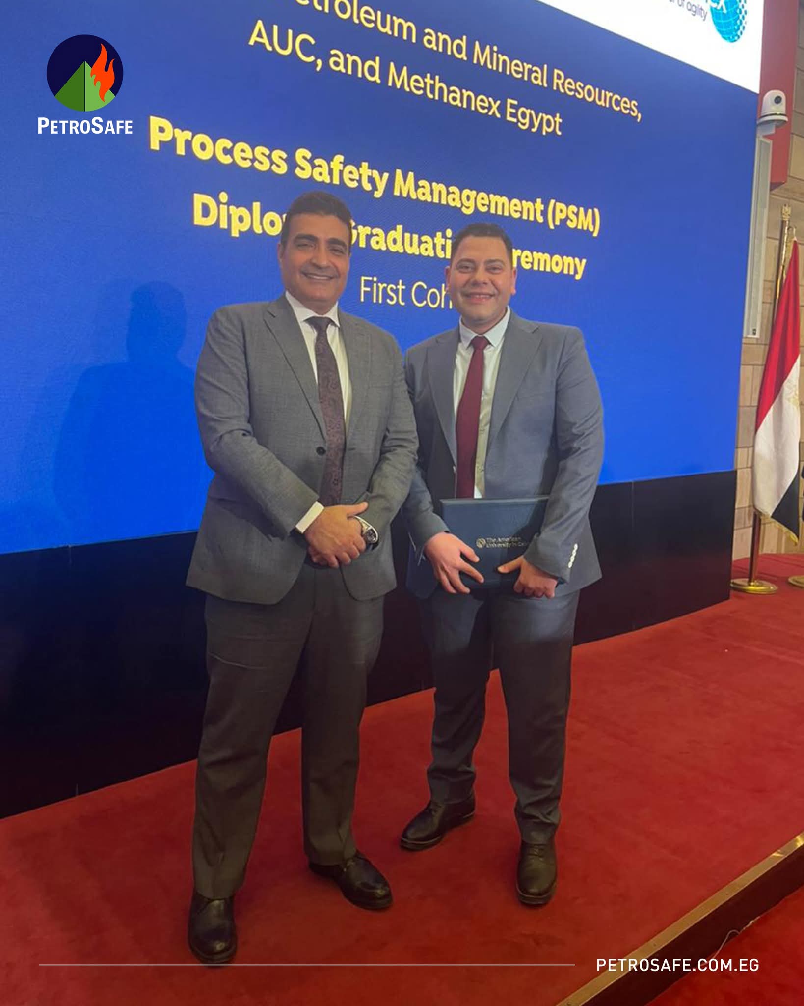 تفخر PetroSafe بدعم أحد كوادرها كيميائى احمد محمد مسعود مدير ادارة بالادارة العامة لشئون السلامة والبيئة في الحصول على أول دبلومة متخصصة في سلامة العمليات في الشرق الأوسط من الجامعة الأمريكية بالقاهرة، تحت رعاية وزارة البترول والثروة المعدنية.