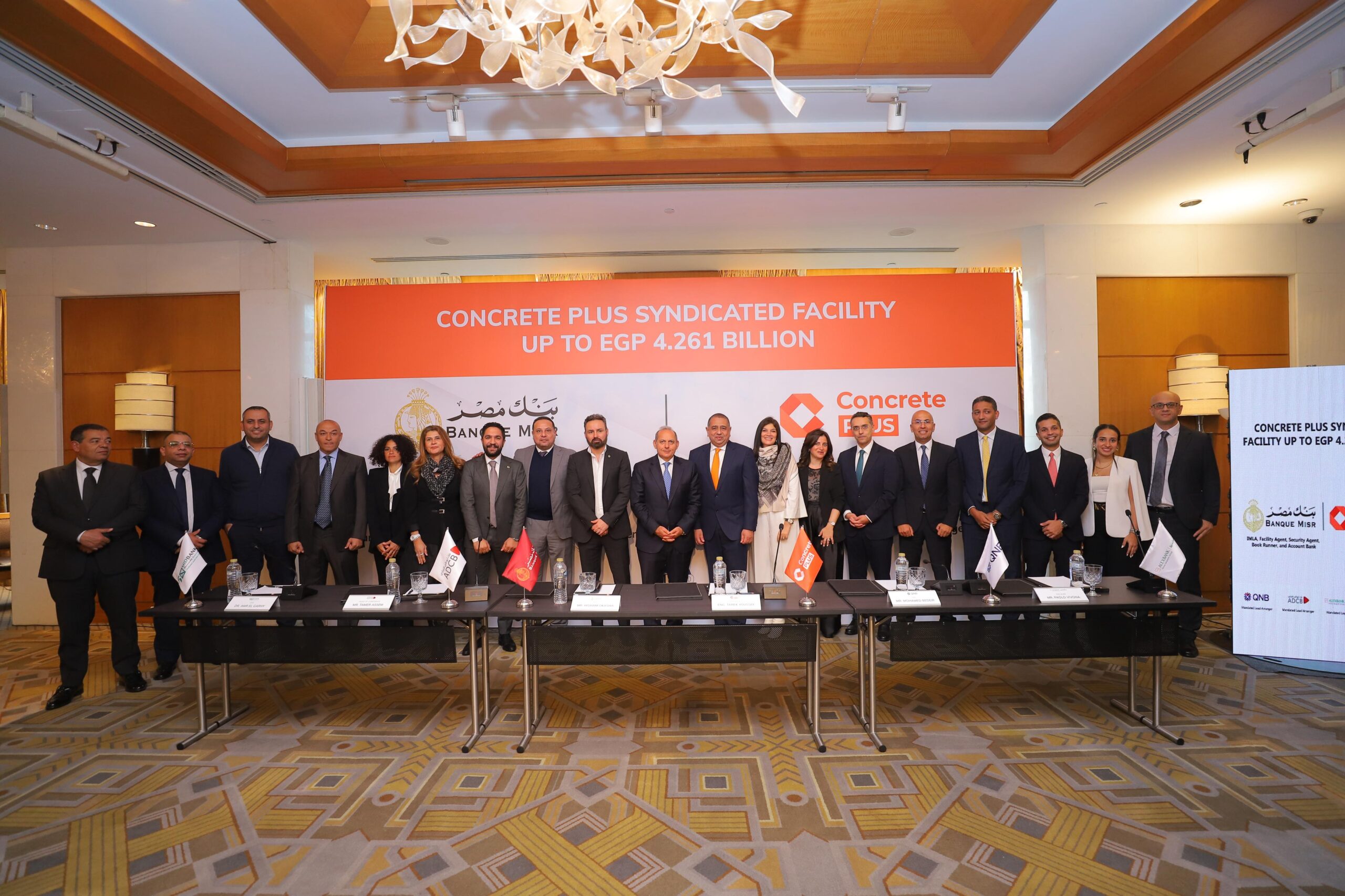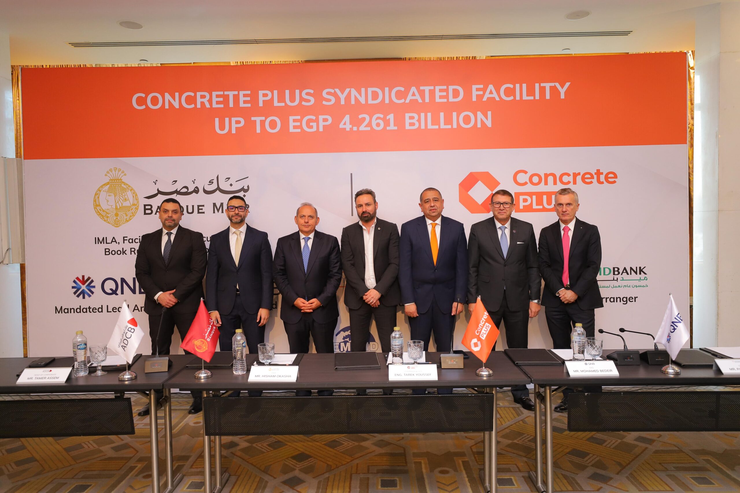 وقد تم التوقيع بحضور الأستاذ/ هشام عكاشه – الرئيس التنفيذي لبنك مصر، والأستاذ/ محمد بدير- الرئيس التنفيذي ل QNB مصر ، و الدكتور عمرو الجارحي وزير المالية الأسبق والرئيس التنفيذي والعضو المنتدب ل ميدبنك ، و الأستاذ باولو فيفونا الرئيس التنفيذي و العضو المنتدب لبنك الإسكندرية ، و الأستاذ /تامر عاصم – رئيس تمويل الشركات ببنك أبو ظبي التجاري مصر ، والأستاذ/ طارق يوسف – رئيس مجلس الإدارة و العضو المنتدب لشركة كونكريت بلس للمقاولات و الصناعة و الأستاذ حسام فكري – نائب رئيس مجلس الإدارة ، و لفيف من قيادات البنوك والشركة.