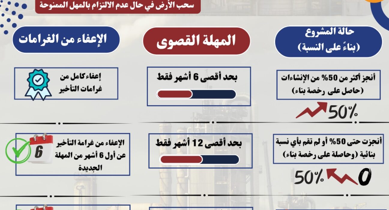 3- المشروعات التي لم تحصل على رخصة بناء وما زالت الأرض في حوزة المخصص له، ولم تقم بتنفيذ أي نسبة بنائية على الأرض، تُمنح مهلة بحد أقصى 18 شهراً لاستخراج رخصة البناء ورخصة التشغيل والسجل الصناعي مع الإعفاء من غرامة التأخير عن فترة الستة أشهر الأولى فقط ويتم تحصيل الغرامات والتكاليف المعيارية عن باقي فترة التأخير.
