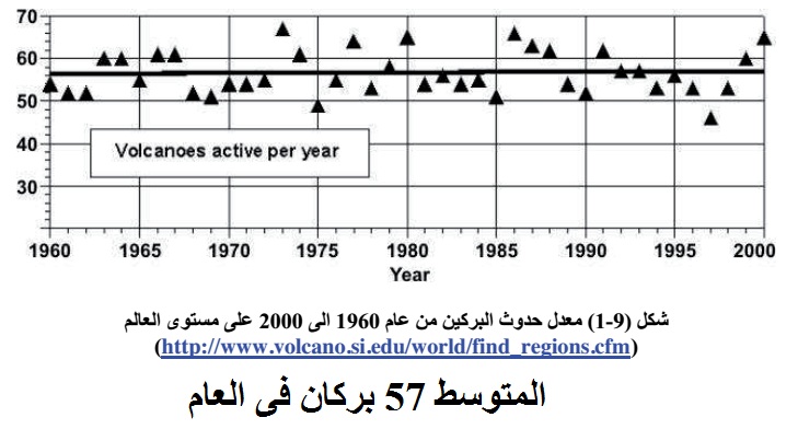 عدد البراكين النشطة على مستوى العالم 516 بركان والزلازل والبراكين آيتان من آيات الله وهما المسئولتان عن تشكيل سطح الأرض، ونظرا للتقدم العلمى الهائل متمثلا فى وسائل الإعلام المختلفة أصبح العالم قرية صغيرة،  مما أدى إلى وجود وعى لدى الناس، مما جعل البعض يعتقد أن عدد البراكين والزلازل أكثر من ذى قبل، وإذا نظرنا الى الشكل المرفق الذى يمثل معدل حدوث البراكين خلال 40 عاما على مستوى الكرة الأرضية لوجدنا العدد ما بين 50 إلى 70 بركان كل عام،  ويقترب المتوسط من 57 بركان.