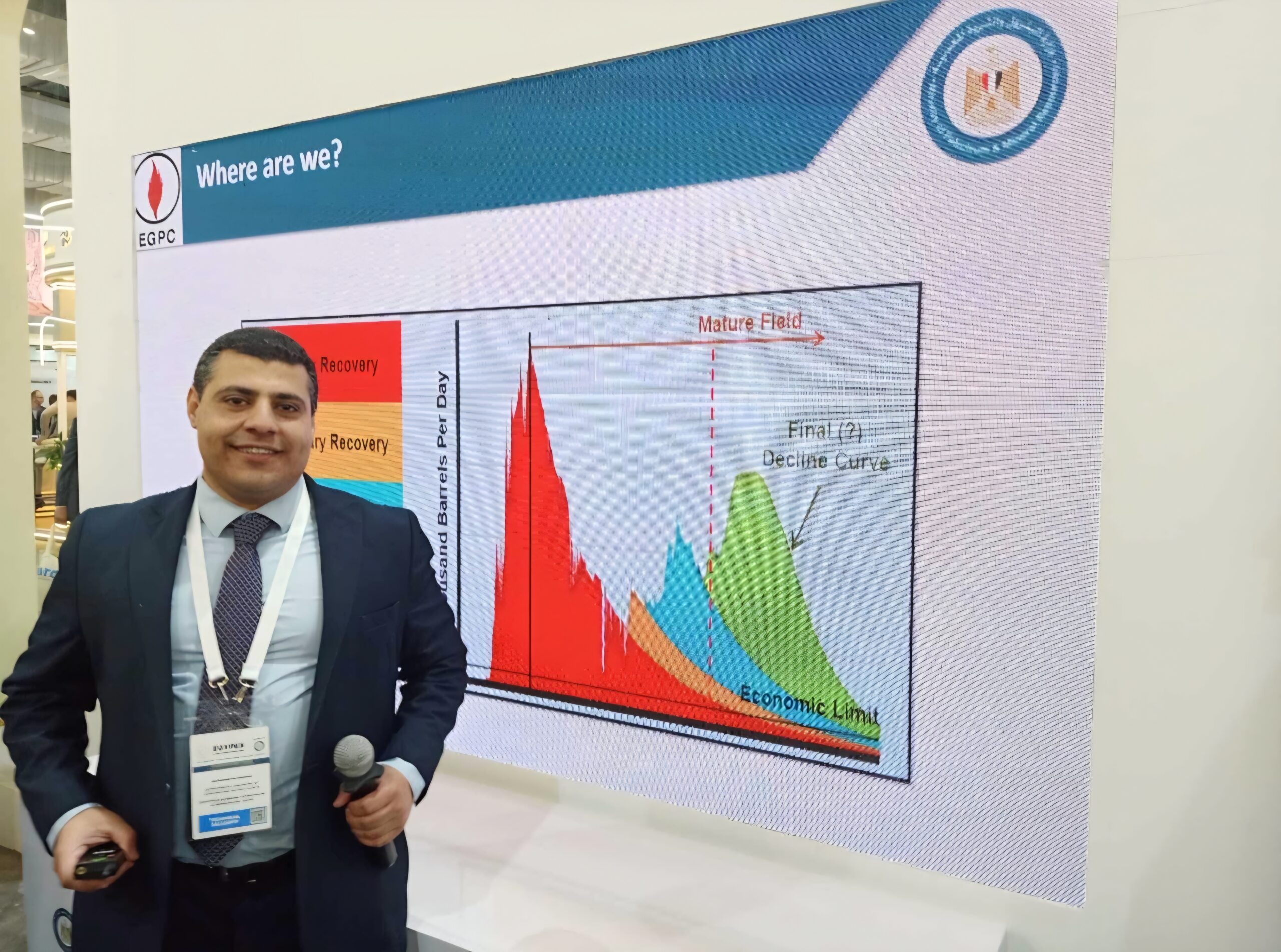 في بداية العرض وضح المهندس/ محمد دويدار مراحل إنتاج الزيت بمراحله المختلفة ووضع مصر الحالي و امتلاك مصر لمخزون هائل من الثروة البترولية في مختلف القطاعات وتحديداً إقليم خليج السويس والصحراء الغربية والتي تحتاج لرفع كفاءة مشروعات حقن المياه وتطبيق طرق مختلفة للاستخلاص المحسن للنفط والتي من شأنها إنتاج زيت لم نكن نستطيع إنتاجه بالطرق التقليدية النمطية كما أشار لدور ذلك في تحقيق الخطة الخمسية كما أبرز التحديات التي تواجه التنفيذ وكيفية العمل في الهيئة المصرية العامة للبترول على تذليلها خلال الفترات الحالية والمقبلة في سبيل تحقيق الخطة الخمسية لقطاع البترول المصري.