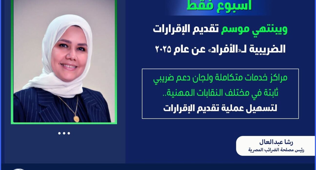 أكدت رشا عبد العال رئيس مصلحة الضرائب الضرائب المصرية قرب انتهاء موسم تقديم الإقرارات الضريبية للأشخاص الطبيعيين «الأفراد» عن عام 2025 حيث لم يتبقَ سوى أسبوع واحد وتنتهي فترة التقديم، موضحةً أننا مستمرون في استقبال الإقرارات الضريبية إلكترونيًا للأشخاص الطبيعيين «الأفراد» حتى 31 مارس الجاري والأشخاص الاعتبارية «الشركات» حتى 30 أبريل المقبل.