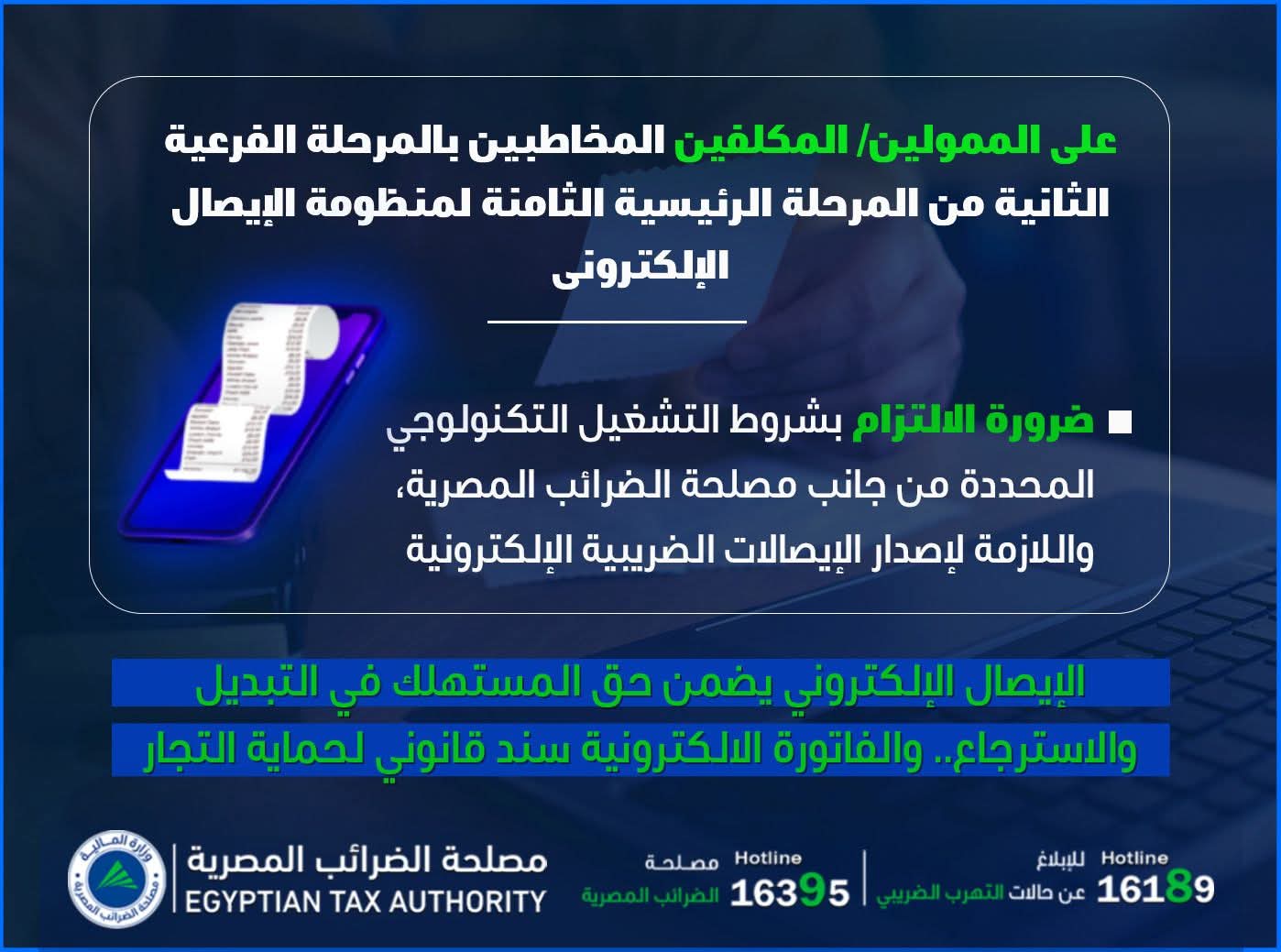 نوهت رشا عبد العال على الممولين/ المكلفين المخاطبين بالقرار رقم (281) لسنة 2025 الخاص بالمرحلة الفرعية الثانية من المرحلة الرئيسية الثامنة لمنظومة الإيصال الإلكترونى، ضرورة الالتزام بشروط التشغيل التكنولوجي المحددة من جانب مصلحة الضرائب المصرية، واللازمة لإصدار الإيصالات الضريبية الإلكترونية، كما يجب الالتزام بالتسجيل على البوابة الإلكترونية الخاصة ببرنامج التحفيز (فاتورتك – حمايتك وجايزتك)، وذلك اعتبارًا من 15 سبتمبر الجاري.