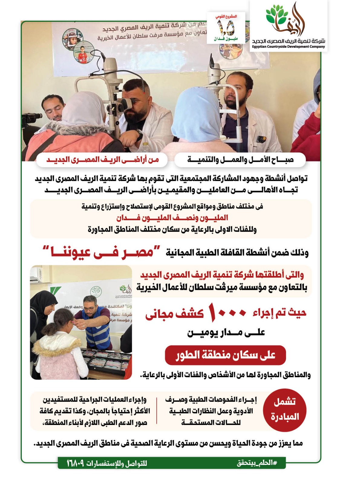 وفى هذا الإطار، شهدت مناطق المشروع خلال الأيام الماضية استمرار فعاليات القافلة الطبية المجانية “مصر فى عيوننا”، والتى أطلقتها شركة تنمية الريف المصرى الجديد