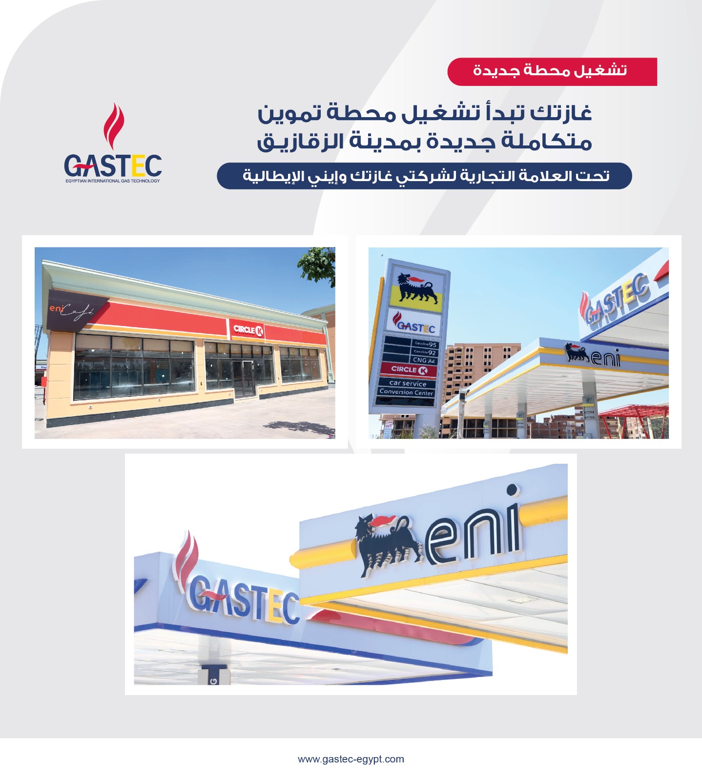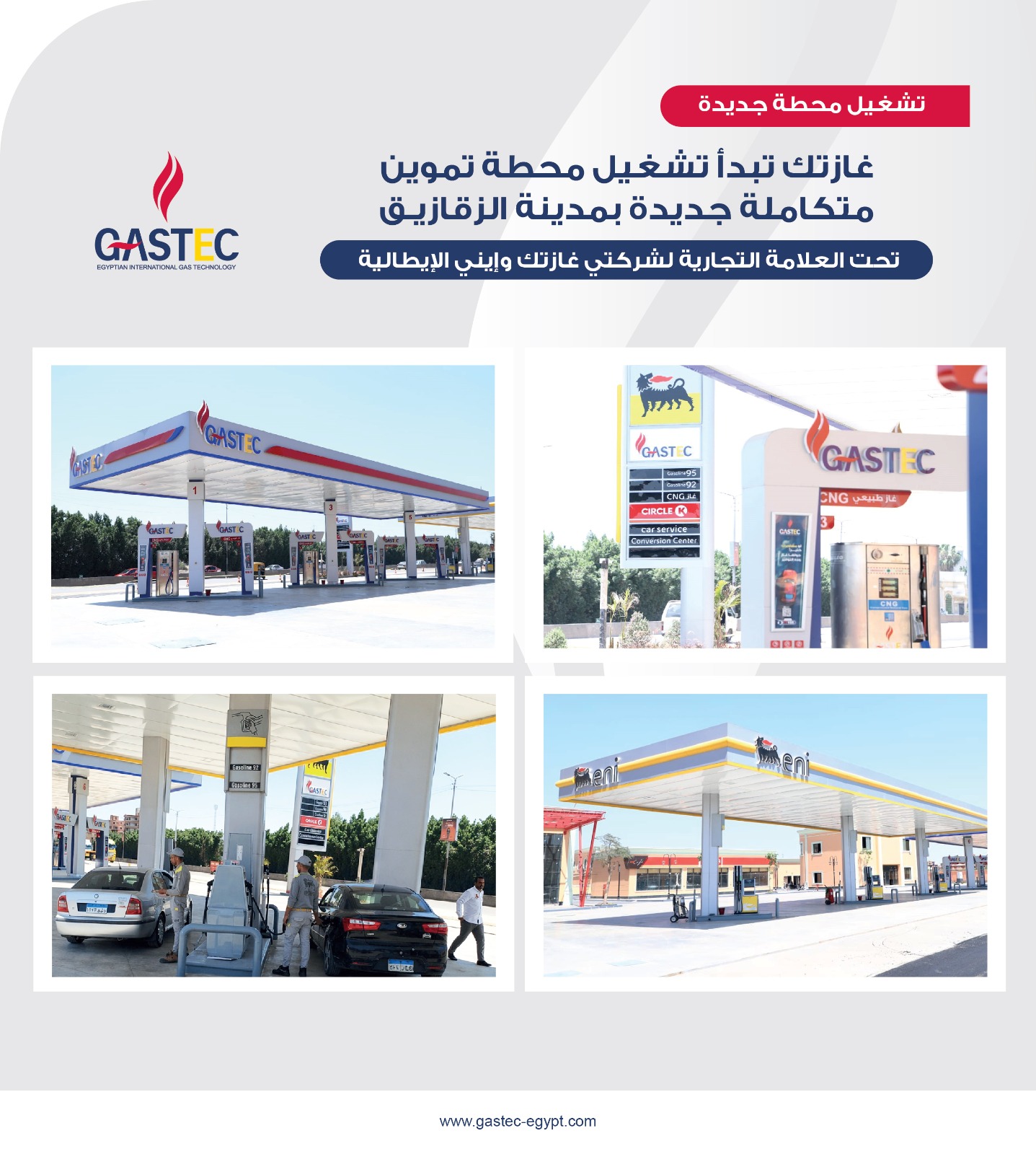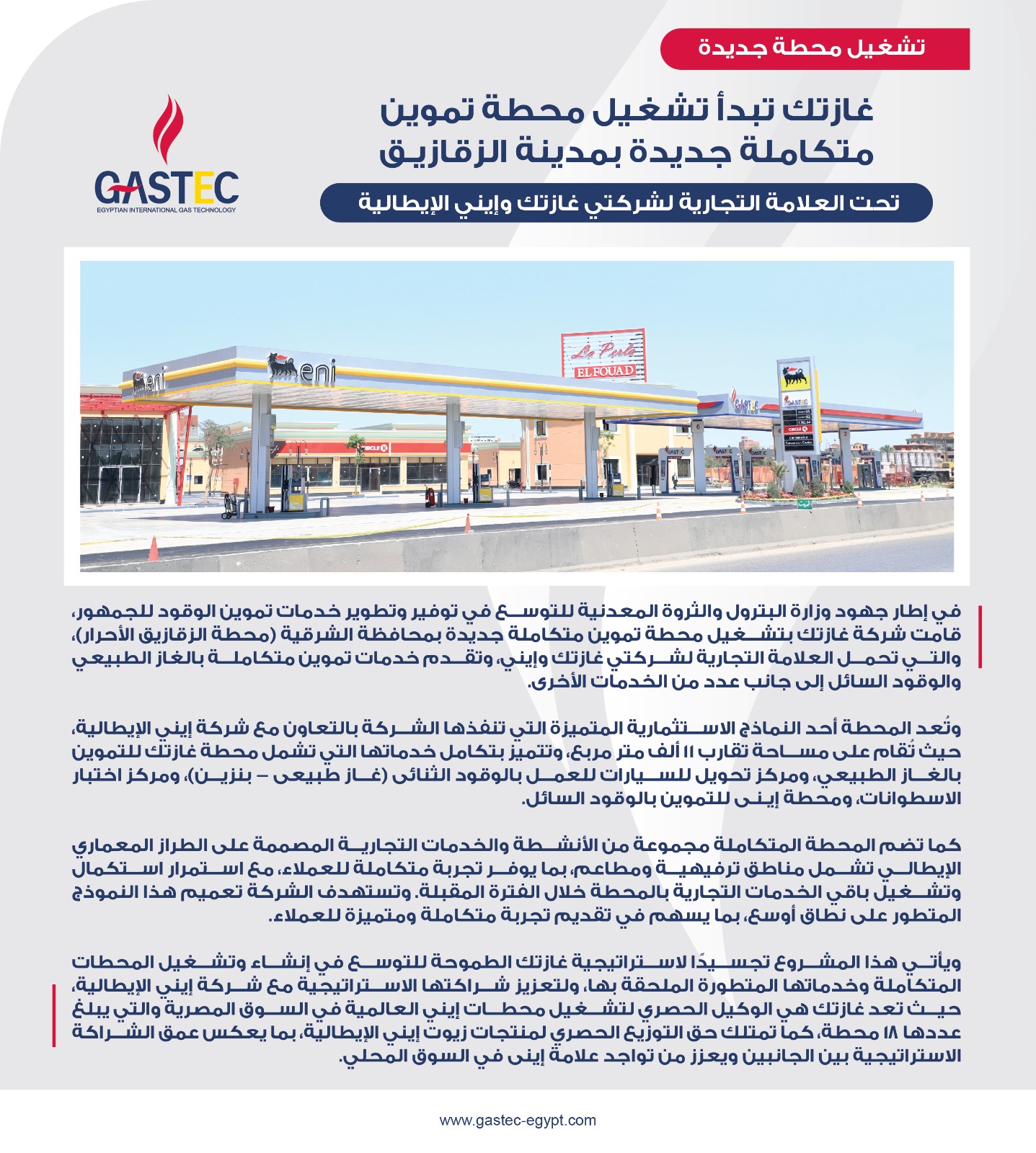 في إطار جهود وزارة البترول والثروة المعدنية للتوسع في توفير وتطوير خدمات تموين الوقود للجمهور، قامت شركة غازتك بتشغيل محطة تموين متكاملة جديدة بمحافظة الشرقية (محطة الزقازيق الأحرار)، والتي تحمل العلامة التجارية لشركتي غازتك وإيني، وتقدم خدمات تموين متكاملة بالغاز الطبيعي والوقود السائل إلى جانب عدد من الخدمات الأخرى.