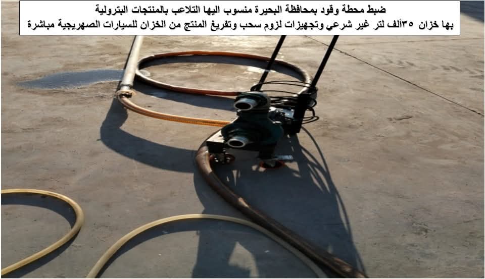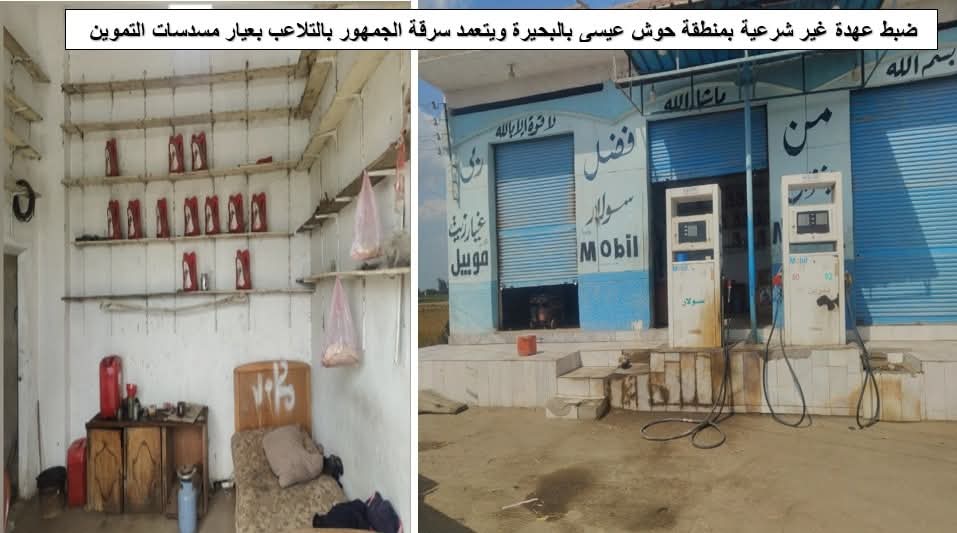 و في مواجهة أوكار التداول غير المشروع، تم ضبط عهدة غير شرعية بمنطقة حوش عيسى بمحافظة البحيرة بدون أي تراخيص أو موافقات، تقوم ببيع منتجات السولار والبنزين 80 والبنزين 92 دون أي وسائل تأمين للموقع، فضلاً عن التلاعب في عيار مسدسات التموين .