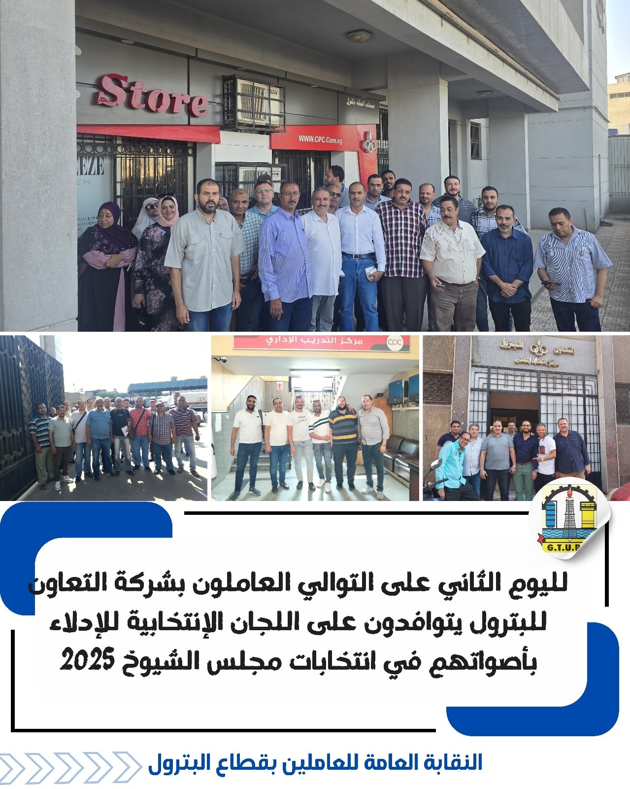 لليوم الثاني على التوالى توافد العاملون بشركة التعاون للبترول على مقار اللجان الانتخابية للإدلاء بأصواتهم في إنتخابات مجلس الشيوخ 2025 دعماً للاستقلال واستمراراً لمسيرة البناء والتنمية.