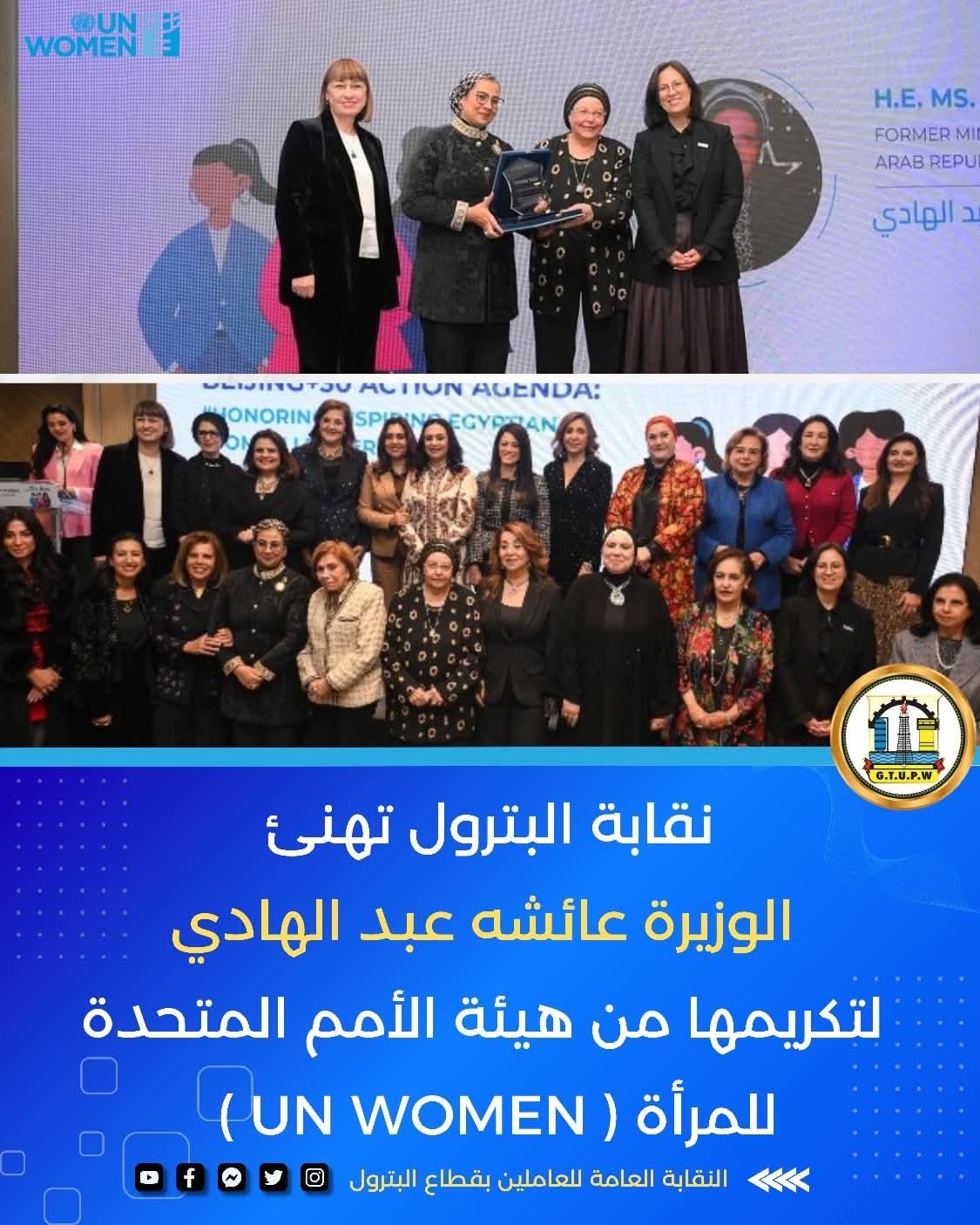 بخالص التهنئة القلبية للوزيره عائشة عبد الهادي وزيرة القوي العاملة والهجرة السابقه بمناسبه تكريم سيادتها من قبل هيئة الأمم المتحدة للمرأة( UN WOMEN ) خلال فاعليات ” اجندة بكين +30 ” تكريم القيادات النسائيه المصرية الملهمة .