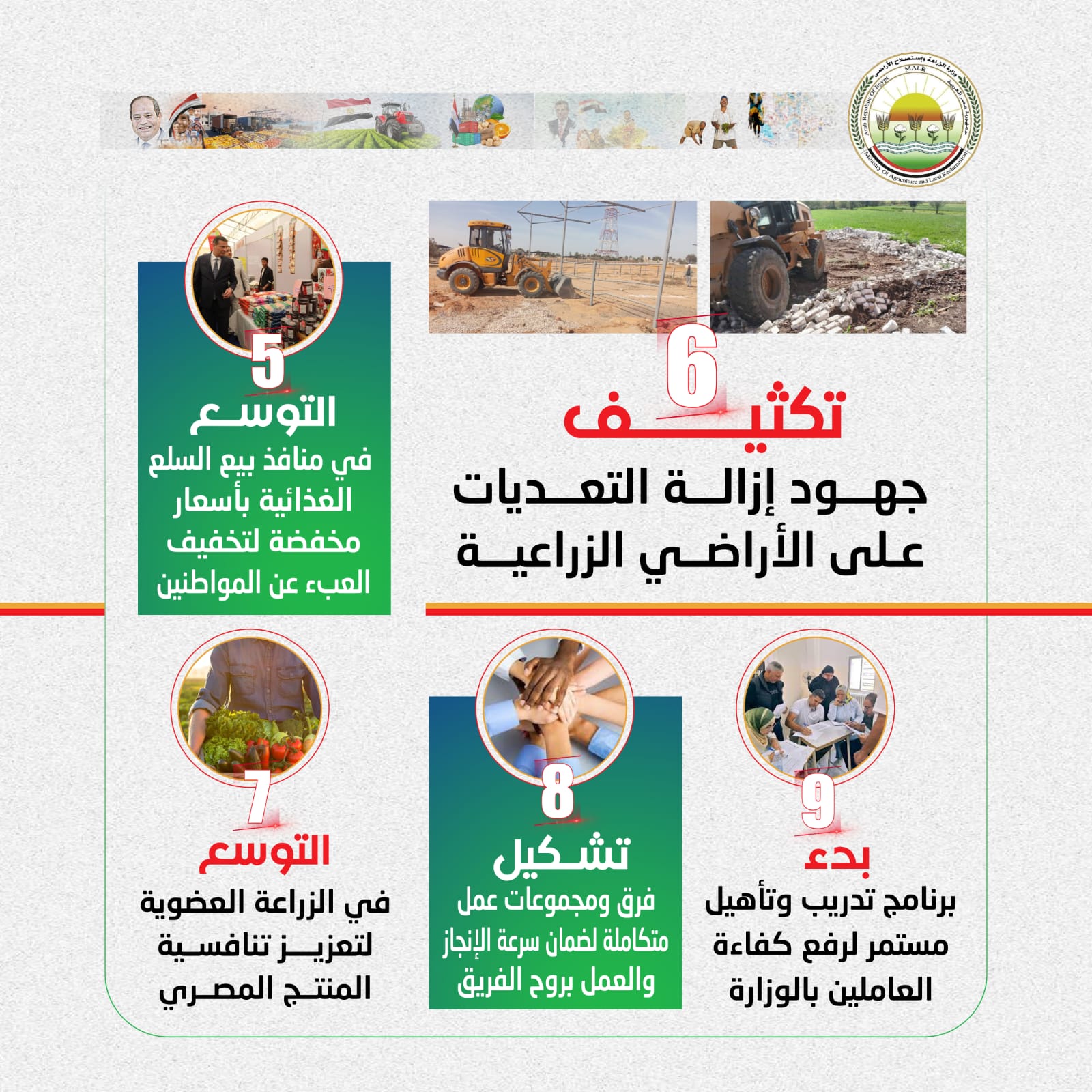 وأكد على ضرورة أن تشمل خطط العمل خلال الفترة المقبلة: تفعيل دور الإرشاد الزراعي والنزول للمزارعين في الحقول، فضلا عن تطوير منظومة الزراعة الآلية وتقديم الخدمات بأسعار مناسبة، إضافة الى التوسع في إقامة منافذ بيع المنتجات والسلع الغذائية بأسعار مخفضة لتقليل الحلقات الوسيطة وتخفيف العبء عن المواطنين، إضافة إلى تكثيف الجهود في ملف إزالة التعديات على الأراضي الزراعية باعتبارها خطاً أحمر.