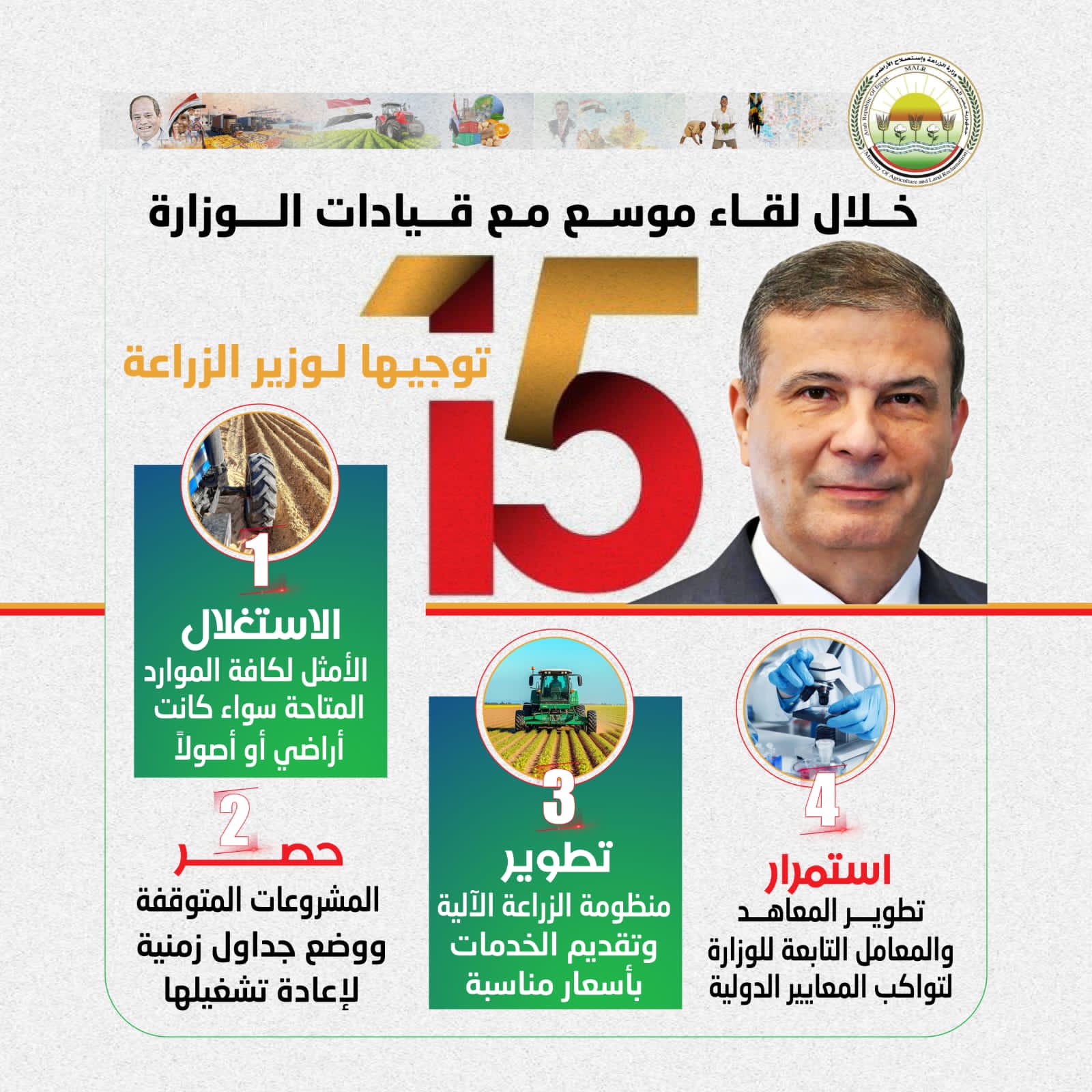 وأكد على ضرورة أن تشمل خطط العمل خلال الفترة المقبلة: تفعيل دور الإرشاد الزراعي والنزول للمزارعين في الحقول، فضلا عن تطوير منظومة الزراعة الآلية وتقديم الخدمات بأسعار مناسبة، إضافة الى التوسع في إقامة منافذ بيع المنتجات والسلع الغذائية بأسعار مخفضة لتقليل الحلقات الوسيطة وتخفيف العبء عن المواطنين، إضافة إلى تكثيف الجهود في ملف إزالة التعديات على الأراضي الزراعية باعتبارها خطاً أحمر.