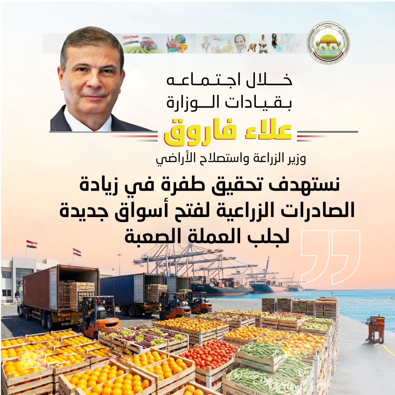 “فاروق” يوجه بإعادة تشغيل المشروعات المتوقفة ودعم كامل للفلاح والمصدرين وتطوير المعاهد البحثية والتوسع في منافذ السلع