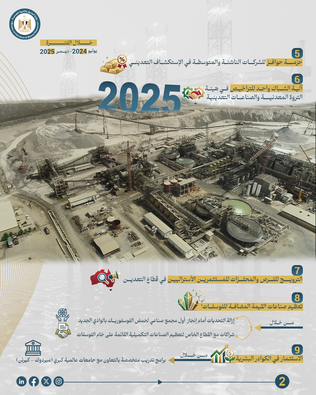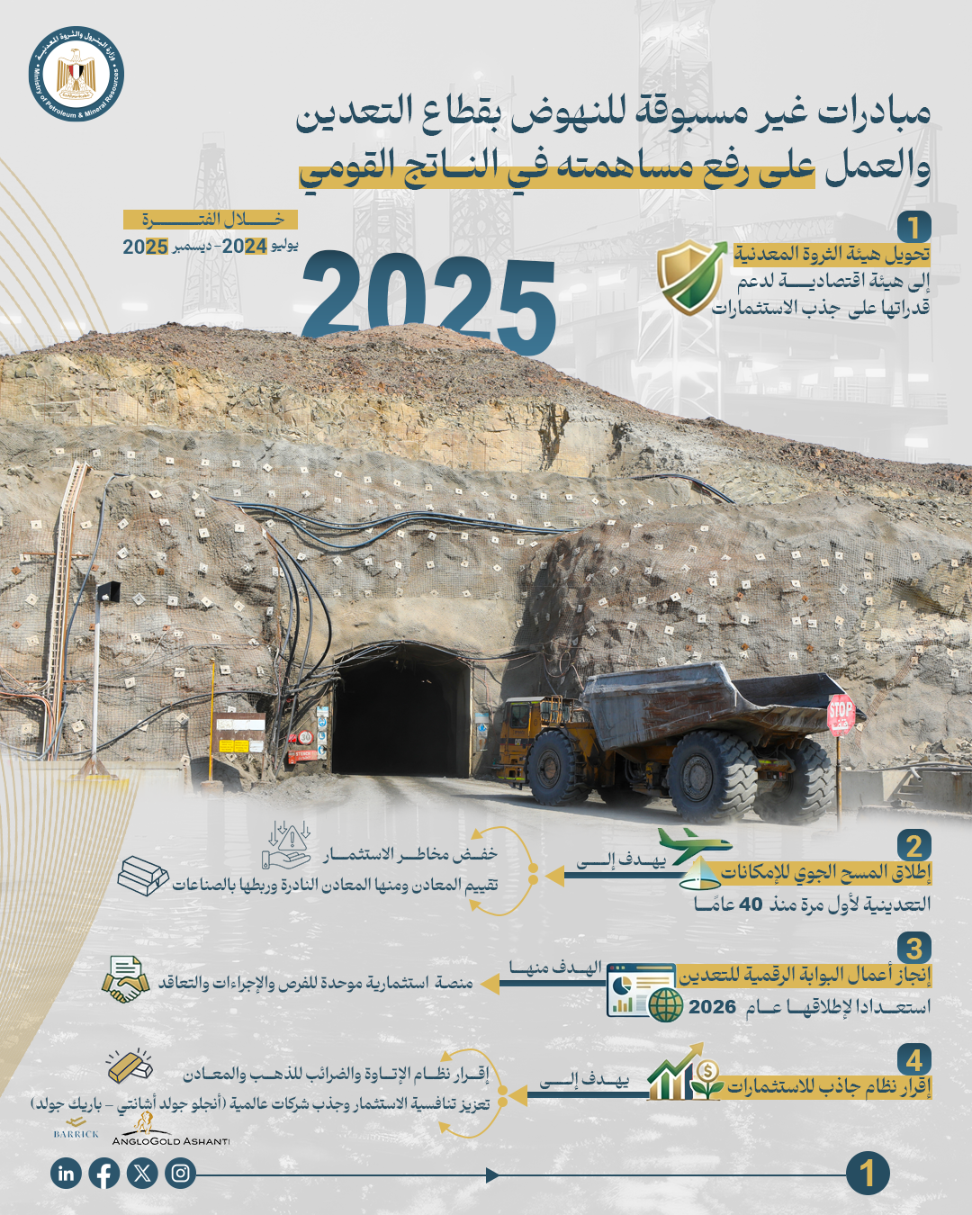 • الانتهاء من مراحل العمل على إطلاق البوابة الرقمية للفرص الاستثمارية في التعدين والمقرر اطلاقها رسمياً خلال النصف الأول من عام 2026، لتكون منصة موحدة تمكن المستثمر من الاطلاع على الفرص وتنفيذ جميع إجراءات التقدم والتعاقد من خلالها.