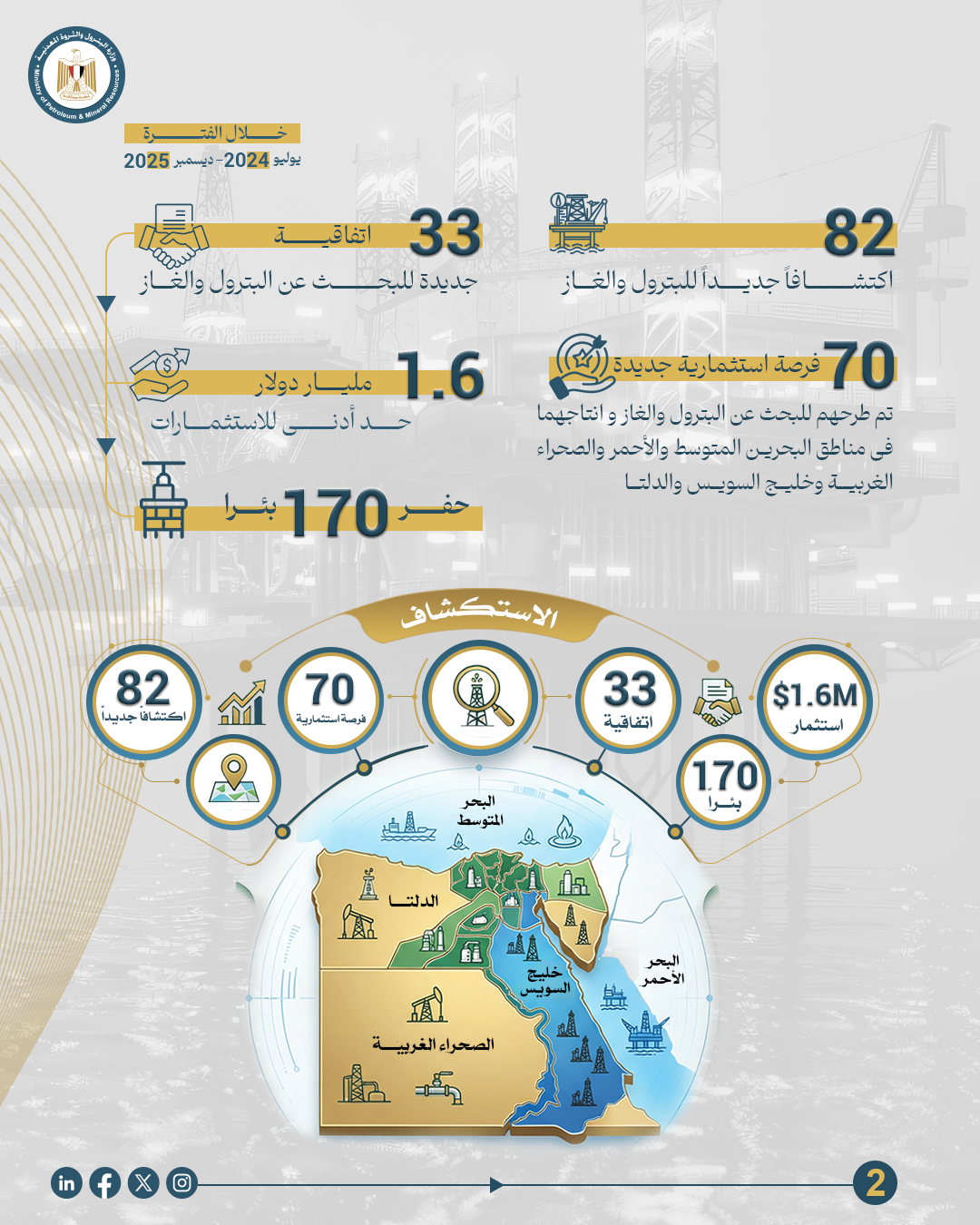 • تم توقيع 33 اتفاقية جديدة للبحث عن البترول والغاز وانتاجهما باستثمارات حدها الأدنى يزيد عن 1.6 مليار دولار وحفر أكثر من 170 بئرًا جديدة.