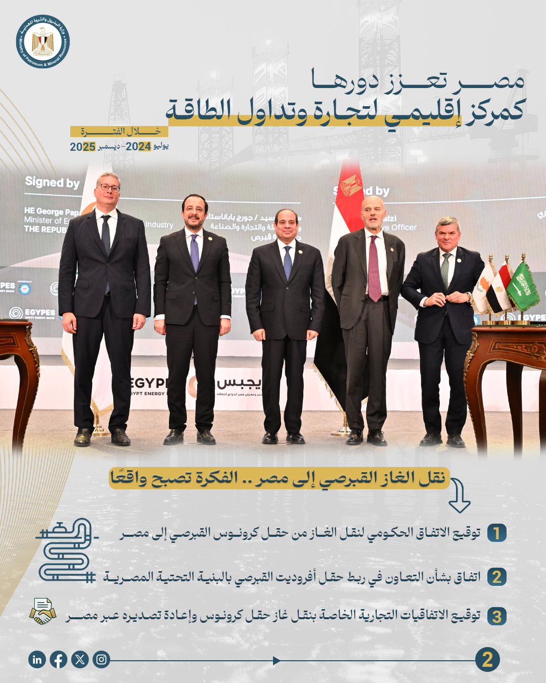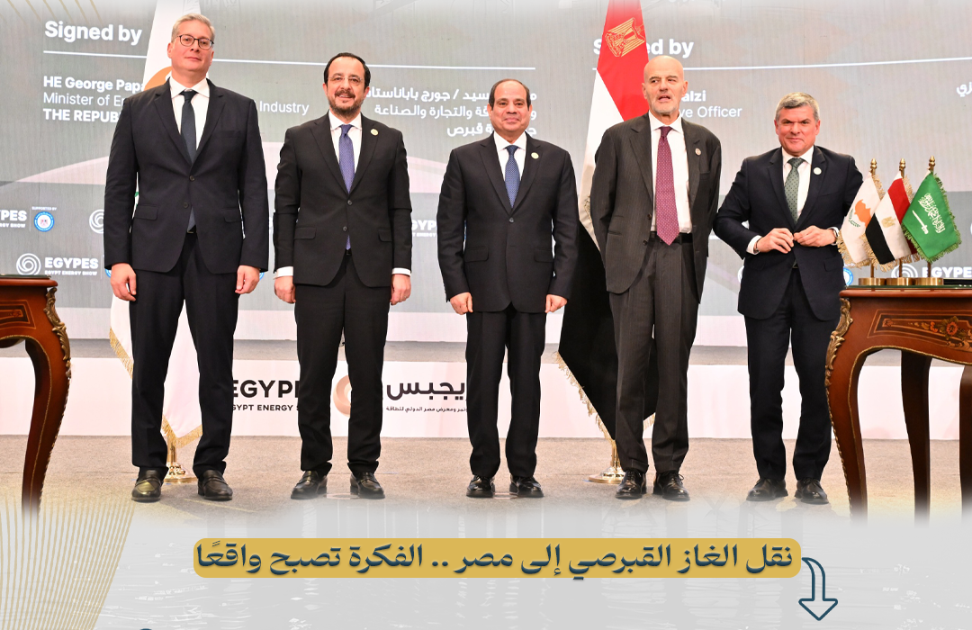 وفي إطار تعزيز مكانتها كمركز إقليمي لتداول وتجارة الطاقة وتعظيم الاستفادة من البنية التحتية القوية في قطاع الغاز والموقع الجغرافي كبوابة لأوروبا ، نجحت مصر في تحويل فكرة نقل الغاز القبرصي إلى واقع ملموس، حيث تم توقيع الاتفاق الحكومي لنقل الغاز من حقل “كرونوس” القبرصي إلى مصر في فبراير 2025  في افتتاح مؤتمر ايجبس بحضور فخامة الرئيس عبدالفتاح السيسى وفخامة رئيس قبرص نيكوس كريستودوليدس بما يعكس عمق التعاون بين البلدين في مجال الطاقة.