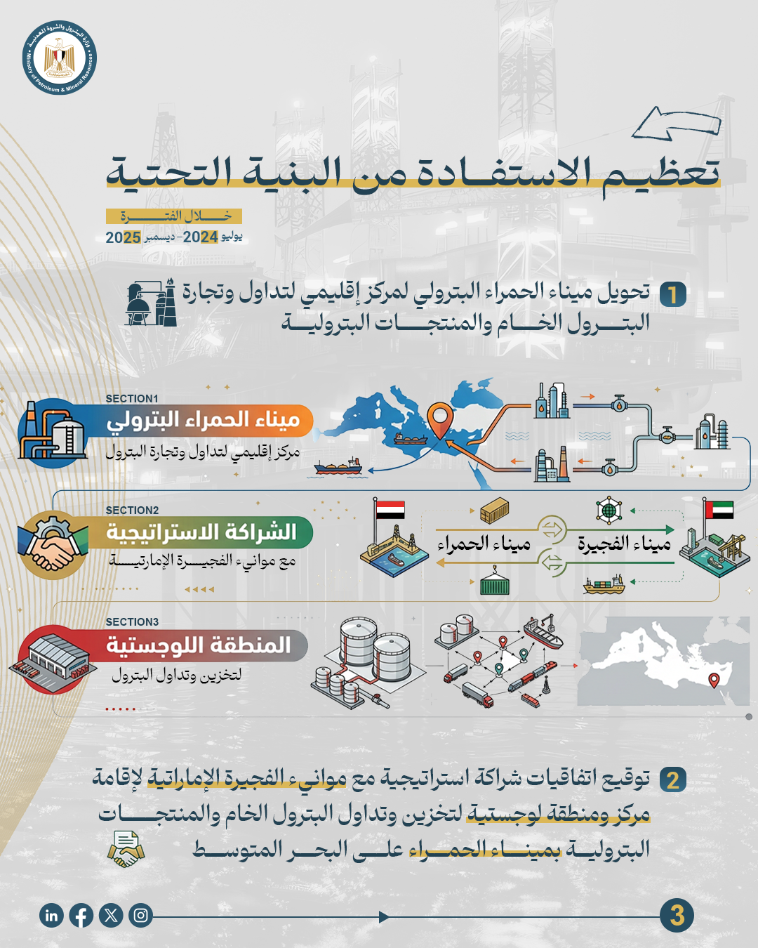 • توقيع اتفاقيات تطوير ميناء الحمراء البترولي بالعلمين الجديدة وتحويله لمركز إقليمي علي ساحل البحر المتوسط لتخزين وتداول وتجارة البترول الخام والمنتجات البترولية، وذلك بالتعاون مع موانئ الفجيرة الإماراتية التي تعد ثاني أكبر مركز عالميا في هذا المجال
