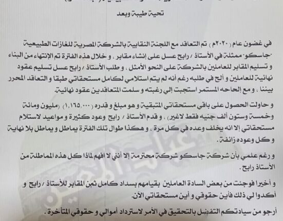 استغلال نفوذ .. ومعاملات مشبوهة، يقوم بها رئيس اللجنة النقابية بشركة جاسكو، بدءا من التلاعب بأموال زملائه مالكي مقابر مدينة العبور، بعد أن