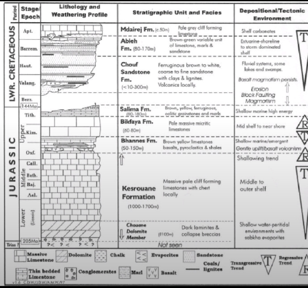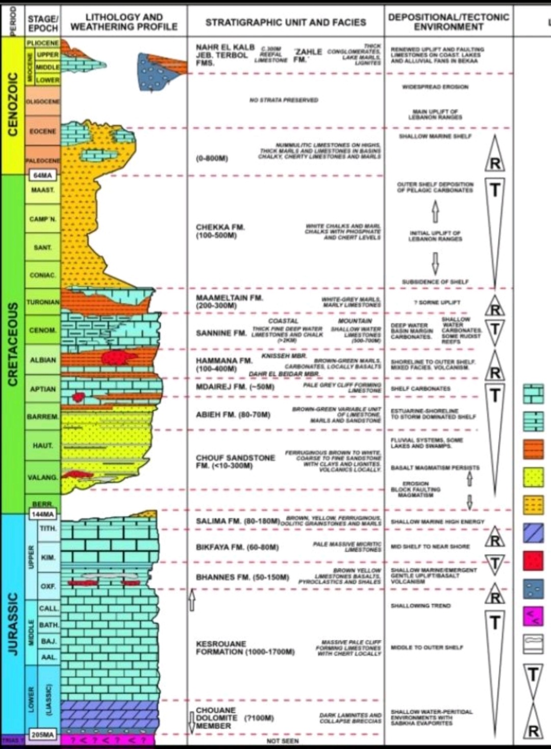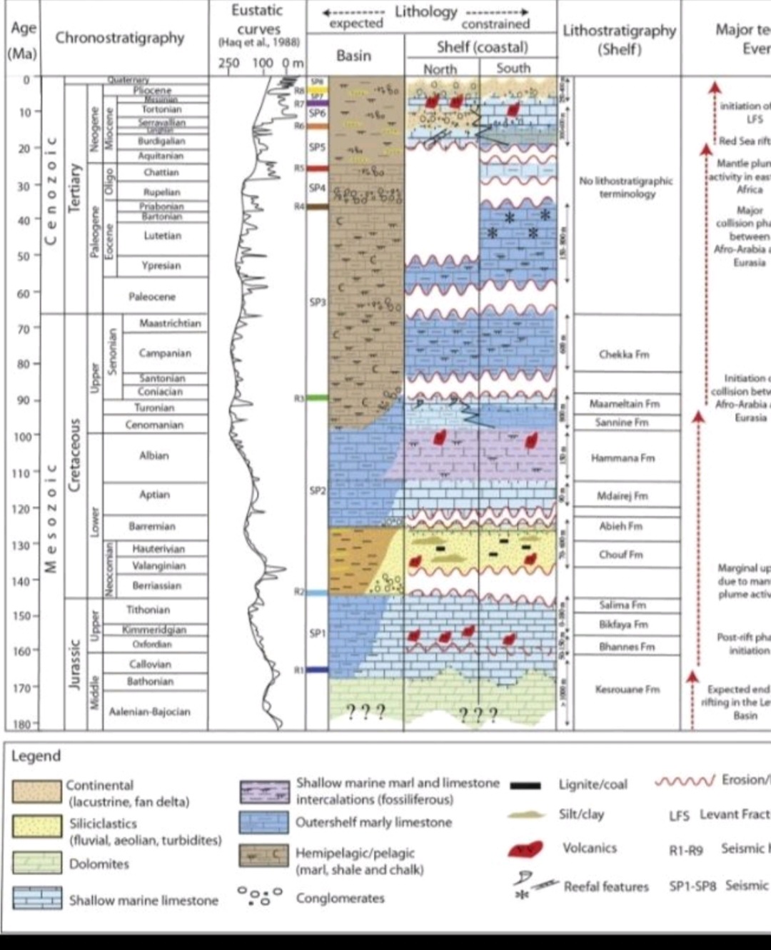 Lebanon’s sedimentary cover is mainly Cenozoic–Mesozoic, with source, reservoir, and seal formations offshore and in limited onshore depressions: