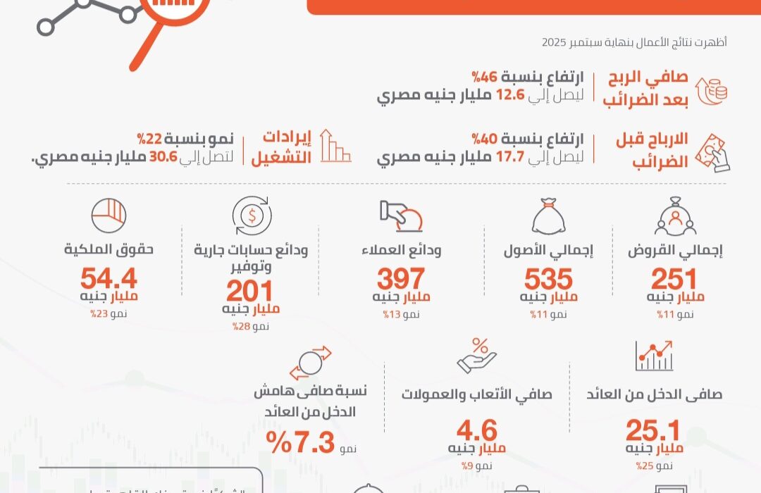 نتائج أعمال بنك القاهرة بنهاية سبتمبر 2025.. نمو إيرادات التشغيل بنسبة 22% لتصل إلى 30.6 مليار جنيه مصري. وارتفاع صافي الربح بنسبة 46% ليصل إلى 12.6 مليار جنيه مصري